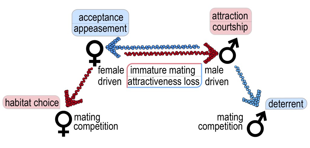 We aim to disentangle the complex interplay of reproductive strategies by investigating pheromonal communication in all contexts: female-to-male (f-m), male-to-female (m-f), male-to-male (m-m), and female-to-female (f-f). Our research addresses key questions: Do female signals honestly reflect fecundity? How do males use chemical signals to appease mates and deter rivals? And do females use conspecific cues to select habitats?